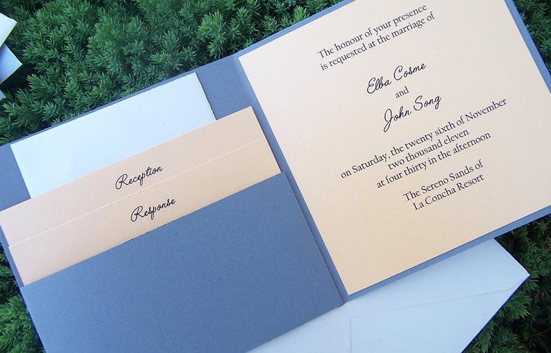 This 5 x 5 pocketfold is unique in so many ways. Wow your guests with this one of a kind invitation featuring linen stock, or your choice of pocketfold color, texture and style. The invitation is closed with a matching belly band topped with ribbon and a tag of your choice. A bow is then placed perfectly on the front completing your invitation. Invitation can be altered in endless ways including but not limited to: color, texture, style, closure method, gem color, size and shape, ribbon style, font color and style, and envelope color, style, and texture.